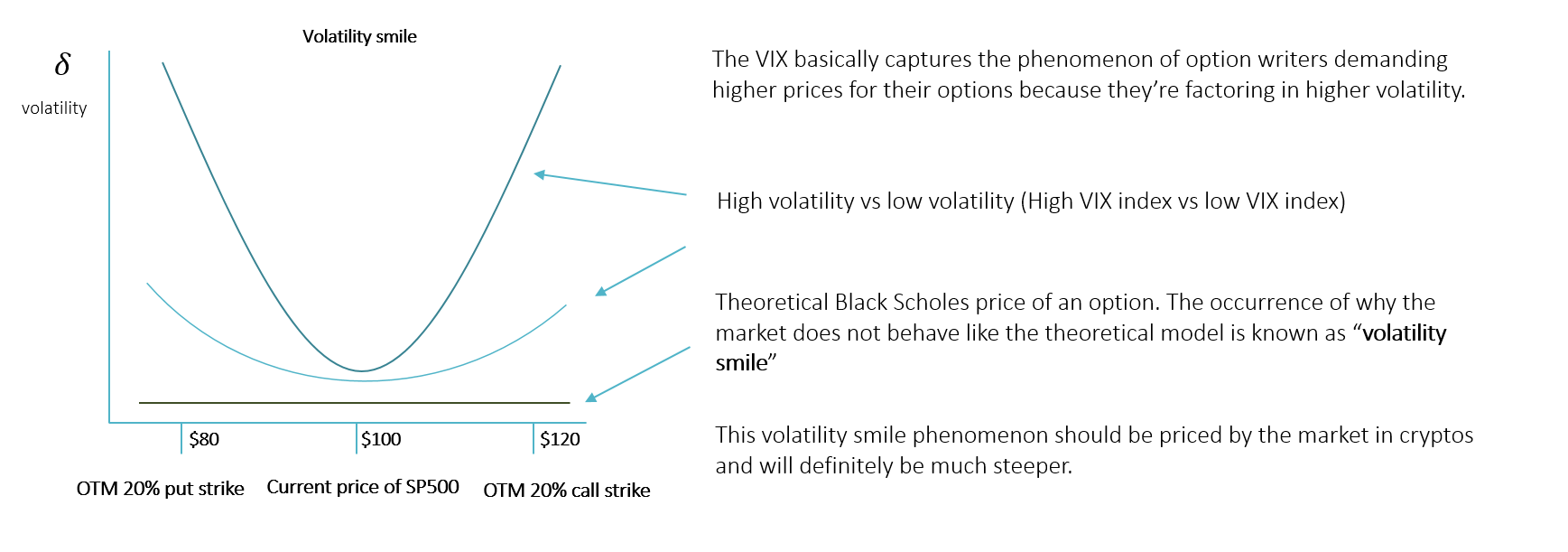 Tom Arnold and John Earl provide an approach for calculating the VIX for any asset here . This same methodology, shown here, can be used to construct a VIX for cryptocurrencies. If one ignores the risk free rate, which is close to zero anyways, then the VIX for a cryptocurrency can be derived within a smart contract and live on the blockchain itself without the need for any oracles.