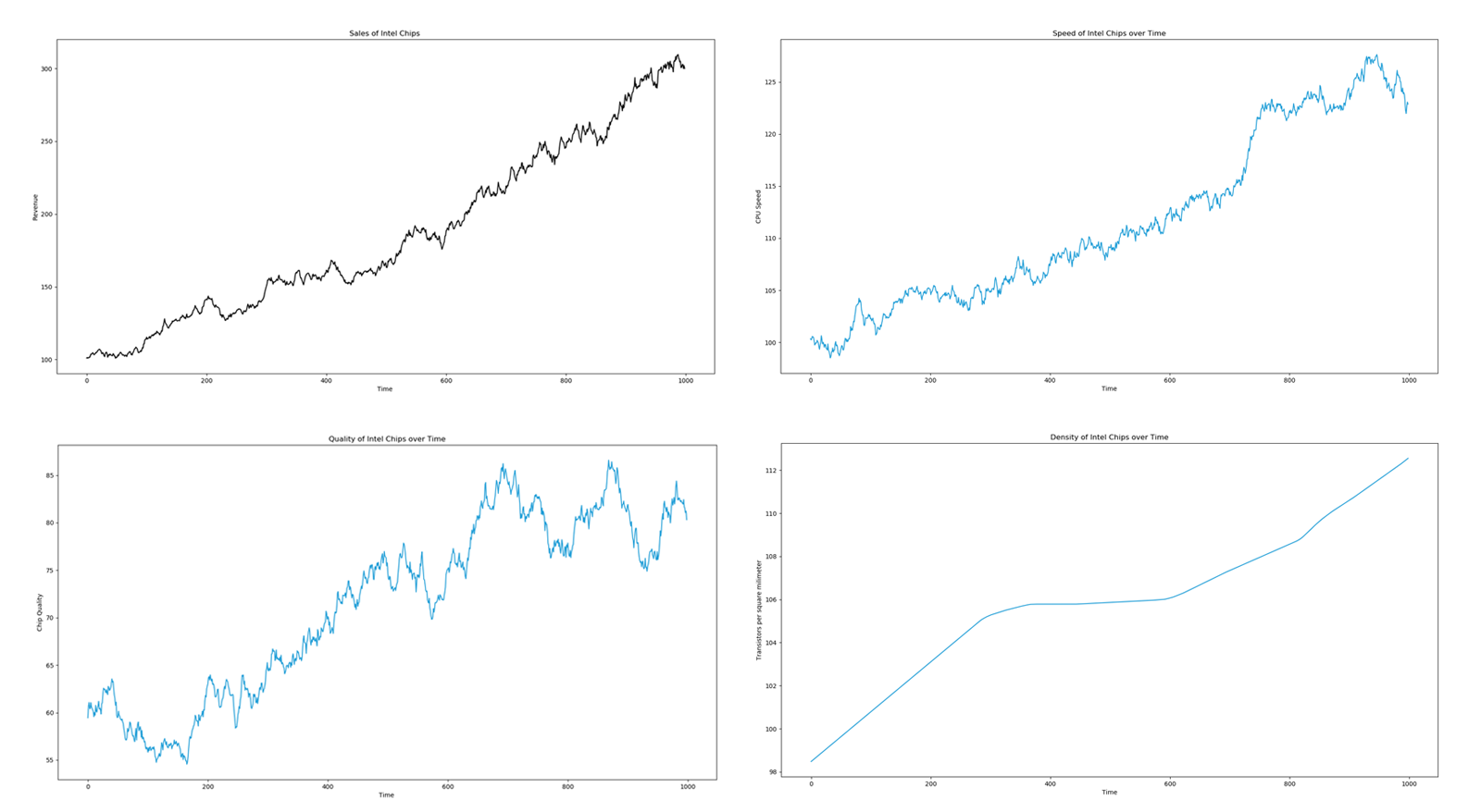Lloyd Shapley was an American Mathematician who won the Nobel-Prize in economics. One of his greatest contributions was the concept of a Shapley value in the field of cooperative game theory. Recently, econometricians have adopted Shapley values as a way to tackle multicollinearity in regressions. It is a highly peculiar approach since one can view a regression as a game between multiple independent variables X competing to see who has the greatest impact on the dependent variable Y. Consider a simple regression with 3 independent variables: $$ Y=\alpha + \beta_1 X_1 + \beta_2 X_2 + \beta_3 X_3 + \epsilon$$ The approach utilized to dealing with muticollinearity with Shapley values involves running multiple permutations of regressions to see which factors truly have the strongest influence on Y and averaging out those contributions. In our three case scenario the total number of permutations of regressions we could run is equal to the factorial of the number of our independent variables X (6): $$ Y=\alpha + \beta_1 X_1 + \epsilon$$ $$ Y=\alpha + \beta_2 X_2 + \epsilon$$ $$ Y=\alpha + \beta_3 X_3 + \epsilon$$ $$ Y=\alpha + \beta_1 X_1 + \beta_2 X_2 + \epsilon$$ $$ Y=\alpha + \beta_1 X_1 + \beta_2 X_2 + \epsilon$$ $$ Y=\alpha + \beta_2 X_2 + \beta_3 X_3 + \epsilon$$ $$ Y=\alpha + \beta_1 X_1 + \beta_2 X_2 + \beta_2 X_3 + \epsilon$$ First we would check how much each independent variable X impacts the dependent variable Y. We then check how different combinations of two variables impact Y. At the end we can check how much of an impact they all have together. This gives us our R-squared values for all of the possible ways Y can be impacted. Now we utilize the Shapley formula which can be basically expressed for econometrics as: $$ \varphi (\beta_i )=\frac {1}{!X} \sum_{coalitions \; excluding \; beta_i}\frac{marginal \; contribution \; of \; \beta_i \; to \; coalition} {number \; of \; coalitions \; excluding \; \beta_i \; i} $$ This will give us the correct beta for each independent variable. Suppose we are a chip manufacturer like Intel and we are looking to adjust our budget to allocate capital across three segments which we think drive our revenue for chip sales. We think that chip speed, chip density, and chip quality are our main factors that impact our sales. We want to figure out how much we could allocate to each department in order to get the best bang for the buck in the future. We at first construct our regression as: $$ Y_{sales} =\alpha + \beta_{s} X_{s} + \beta_{d} X_{d} + \beta_{q} X_{q} + \epsilon$$ Where s=speed, d=density, q=quality. I've generated a randomized data set for these variables and made them all drift upwards. The black graph is the dependent sales variable while the blue are the independent variables.